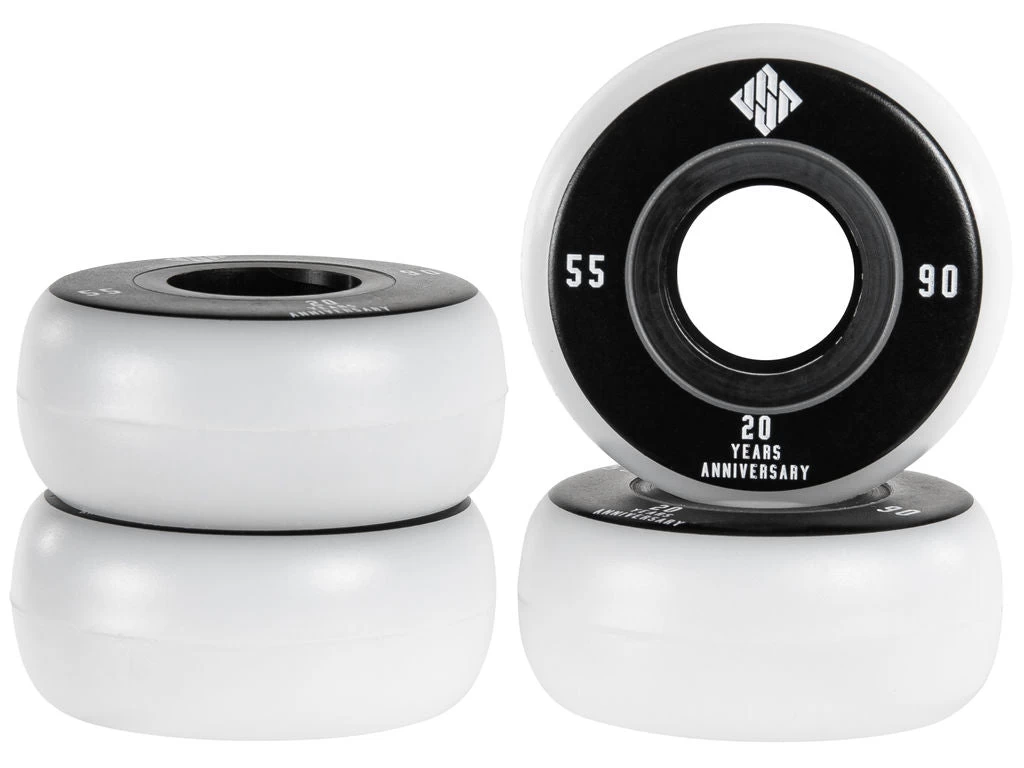 Set of 4 USD wheels in 55mm 90a, if you are looking for a set of replacement aggressive wheels or just wanted to step up your current setup these make a great value choice. Smooth but still durable these nice and simple wheels will get the job done.