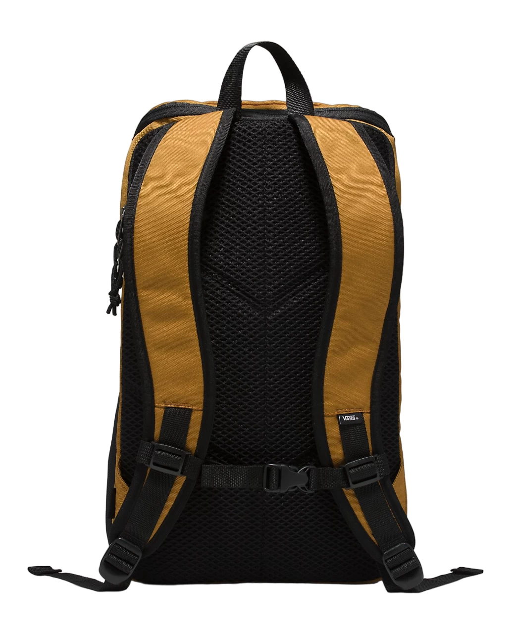 The Vans Obstacle Skatepack in Golden Brown is a 100% nylon skate backpack made with CORDURA® fabrics that are recognized for their long-lasting durability and resistance to abrasion, tearing, and scuffs. Featuring one large main compartment with anti-odor treatment, ergonomic padded shoulder straps, a waffle mesh back panel, and stretch mesh water bottle pockets, it also includes a padded laptop compartment that fits most 15”/ 38 cm laptops, an external zip pocket, adjustable hideaway skate straps to carry your board or jacket, and an adjustable sternum strap. Measuring 45.72 L x 27.94 W x15.24 D cm, it has a 23-liter capacity.